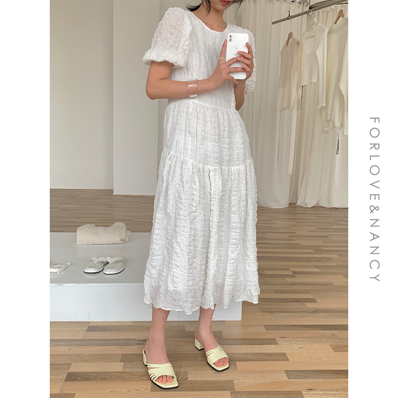 FN2021春夏复古原创设计法式小众圆领泡泡袖拼接连衣裙女81103热门设计联盟服务商